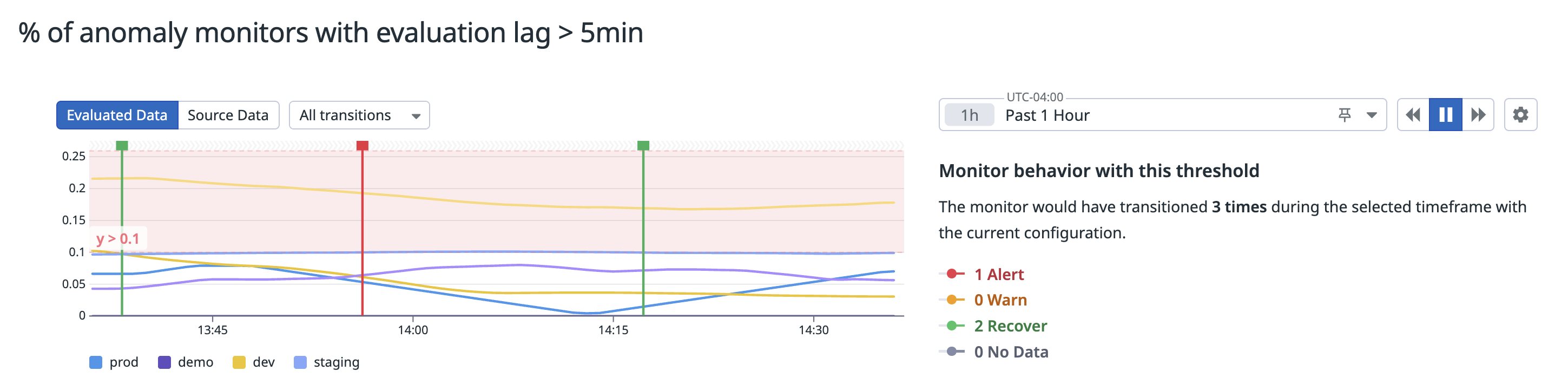 The Evaluation Data graph shows how your monitor would have evaluated the data using your current query and thresholds. With Evaluation Preview, you can