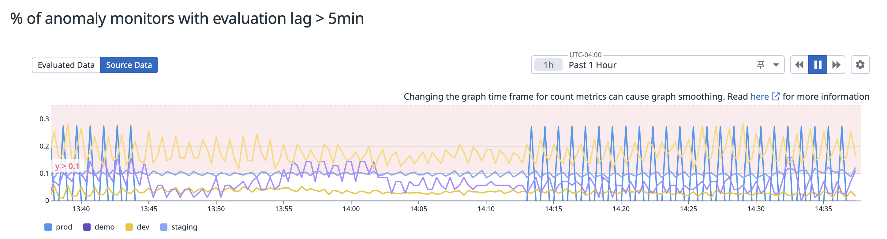 The Source Data graph displays the raw timeseries or query output for your monitor, without any threshold evaluation or alert logic applied. This allows you to: