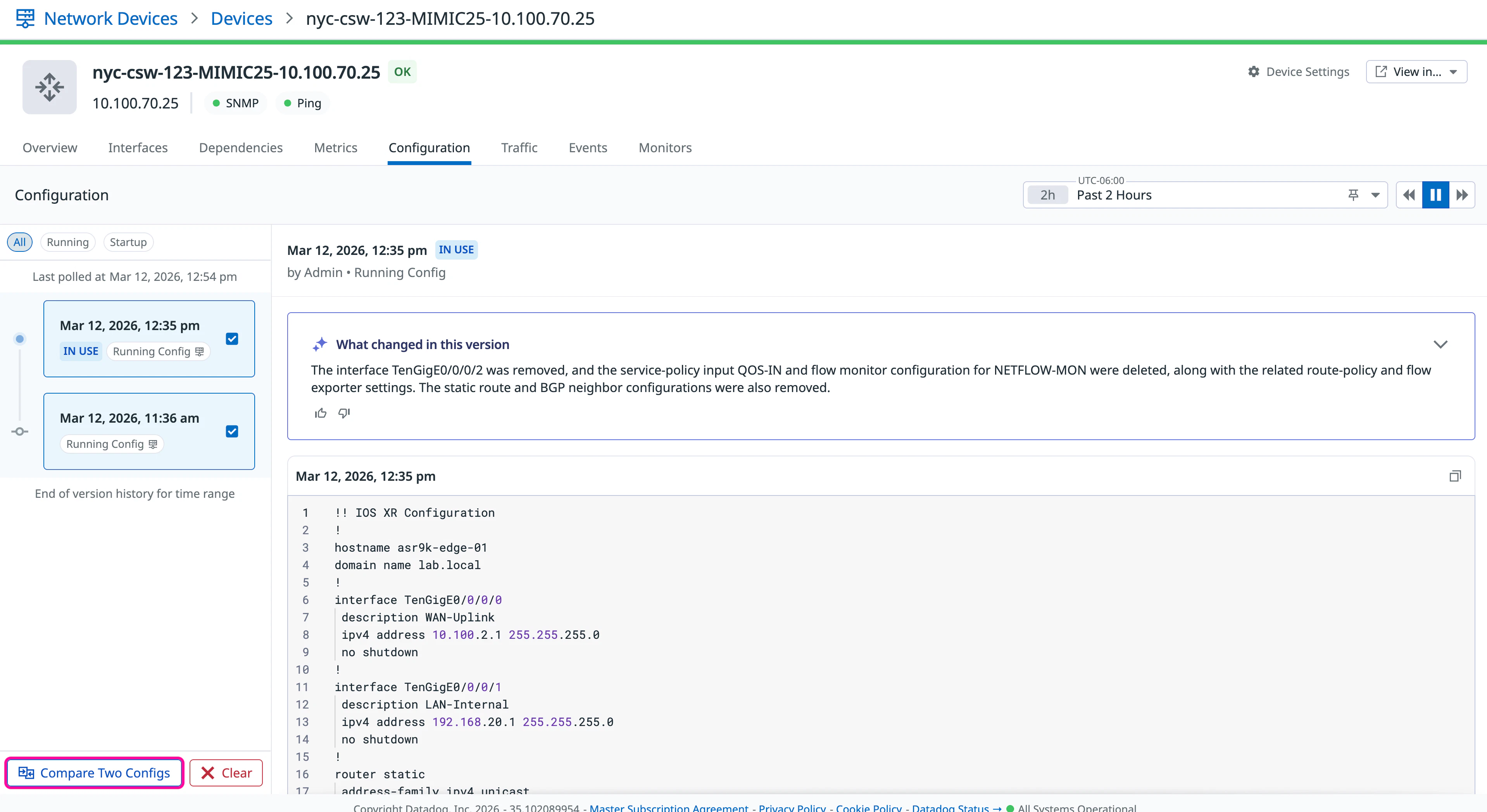 Network Configuration Management is in Preview. To request access and receive the custom Datadog Agent build, contact your Datadog representative.