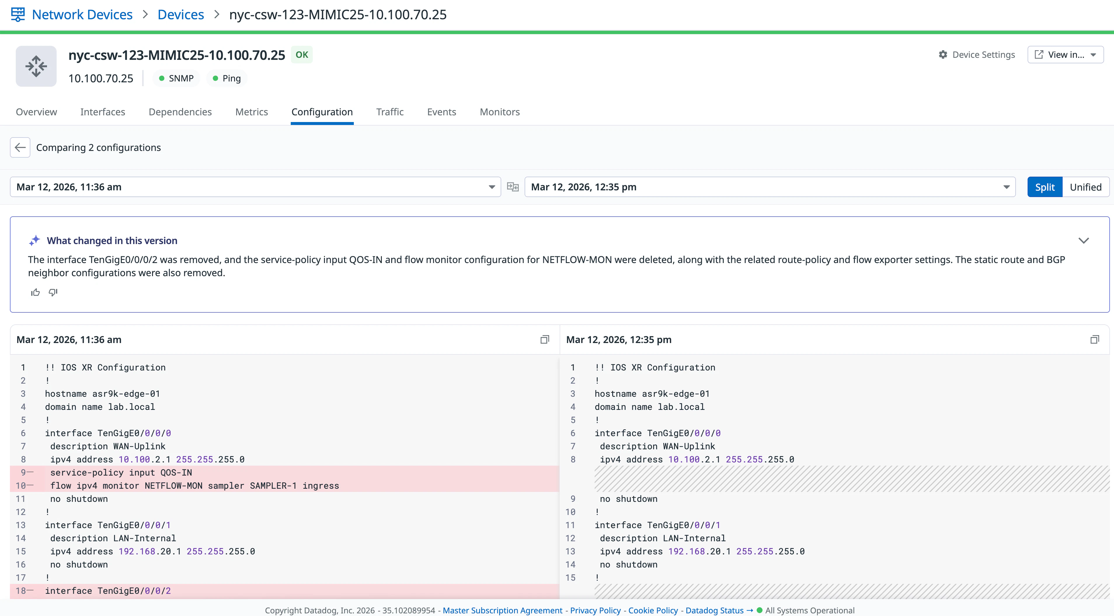 You can scroll through the configuration to investigate the device state during an incident, or adjust the time range to view configurations from different time periods.