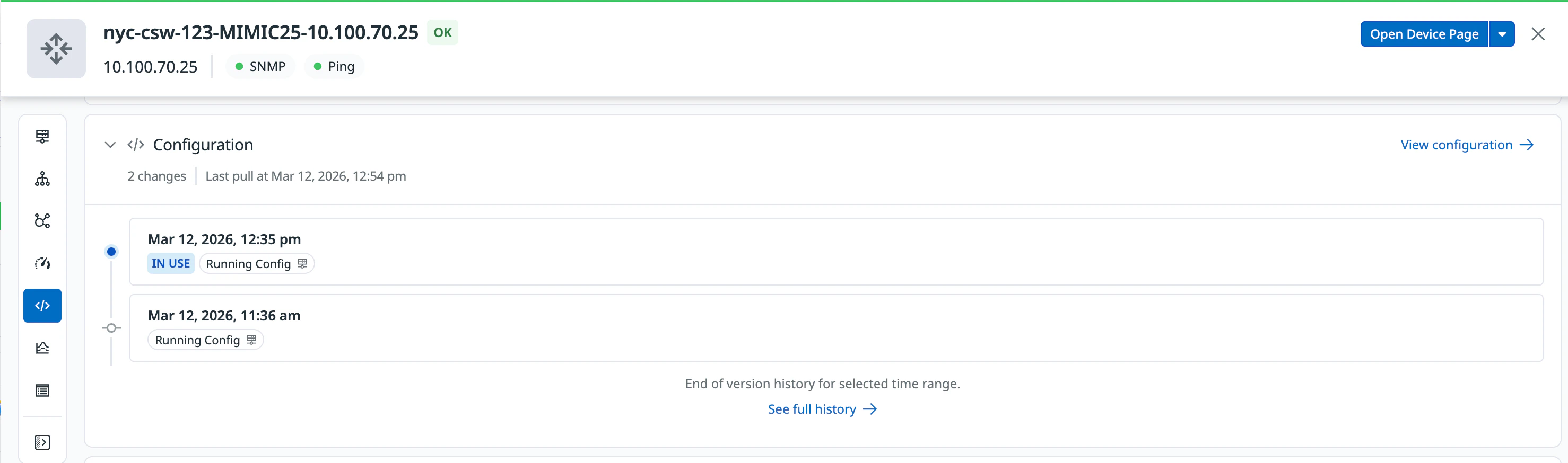 Note: Configuration history begins when NCM is enabled for your account. Historical data prior to enablement is not available.