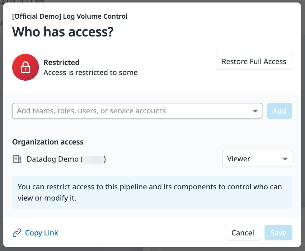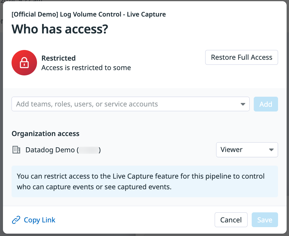 Granular access control lets you restrict access to individual resources by roles, Teams, or users. For Observability Pipelines, you can restrict access to a pipeline or restrict access to Live Capture for a pipeline.
