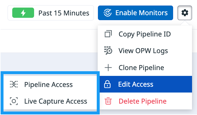 - You can lock yourself out of Live Capture for a specific pipeline even if you created the pipeline. When you edit granular access restrictions for Live Capture access and you want to have Editor access for Live Capture, make sure you are one of the users or part of a Team or role with Editor access.