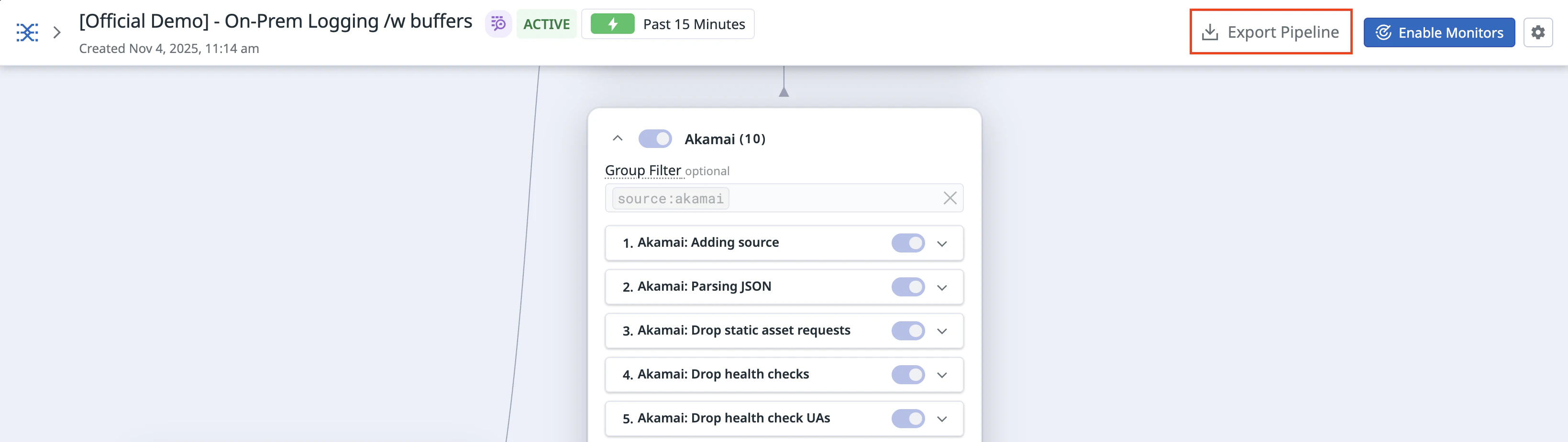 The Observability Pipelines log highlighted on the pipeline page