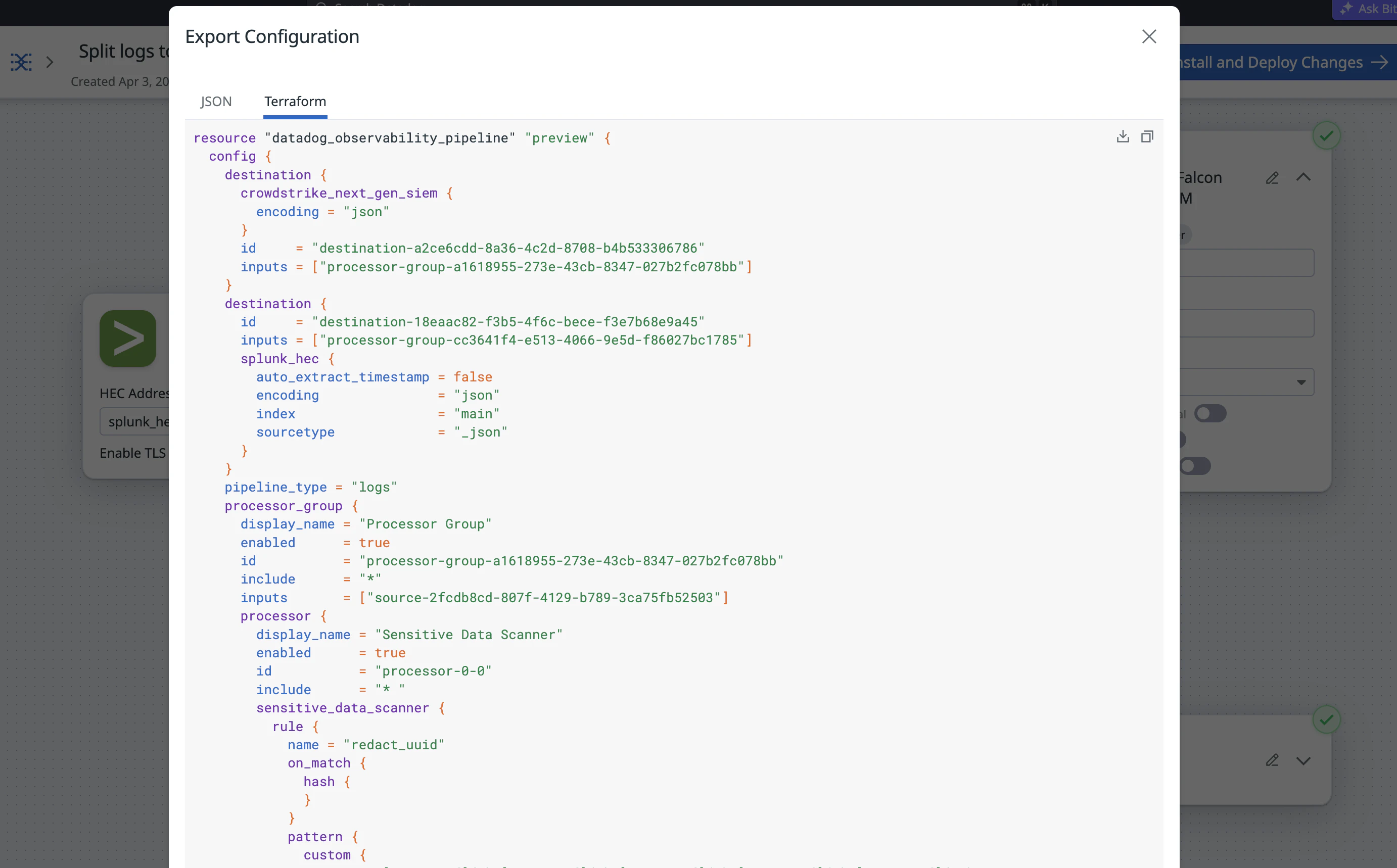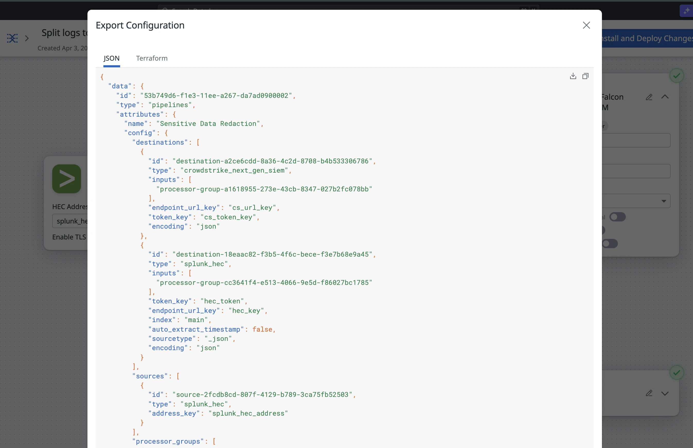 Export a Pipeline Configuration to JSON or Terraform