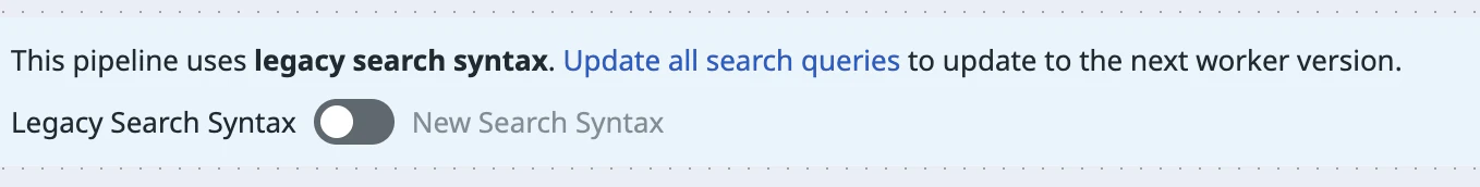 - On the pipeline editor page, by default Legacy Search Syntax is enabled because your pipeline is running the search syntax of Worker 2.10 or older.