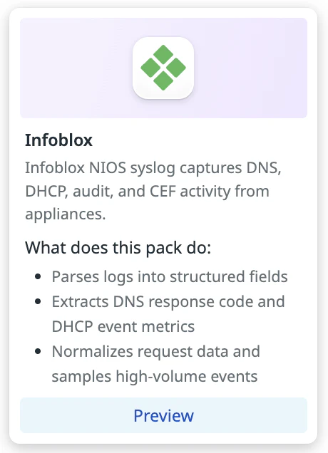 Infoblox NIOS syslog captures DNS, DHCP, audit, and CEF activity from appliances.