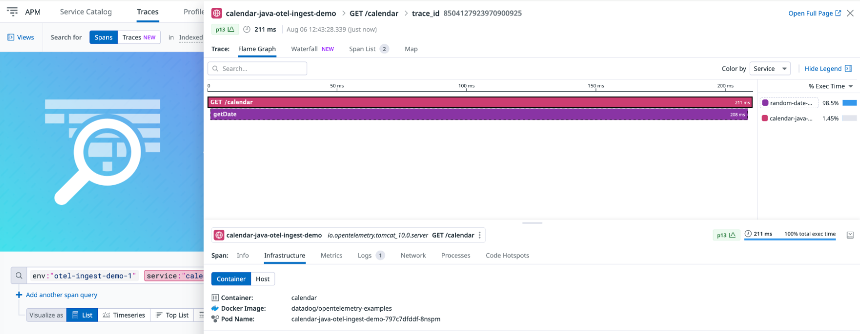 View traces and spans to observe the status and performance of requests processed by your application, with infrastructure metrics correlated in the same trace.