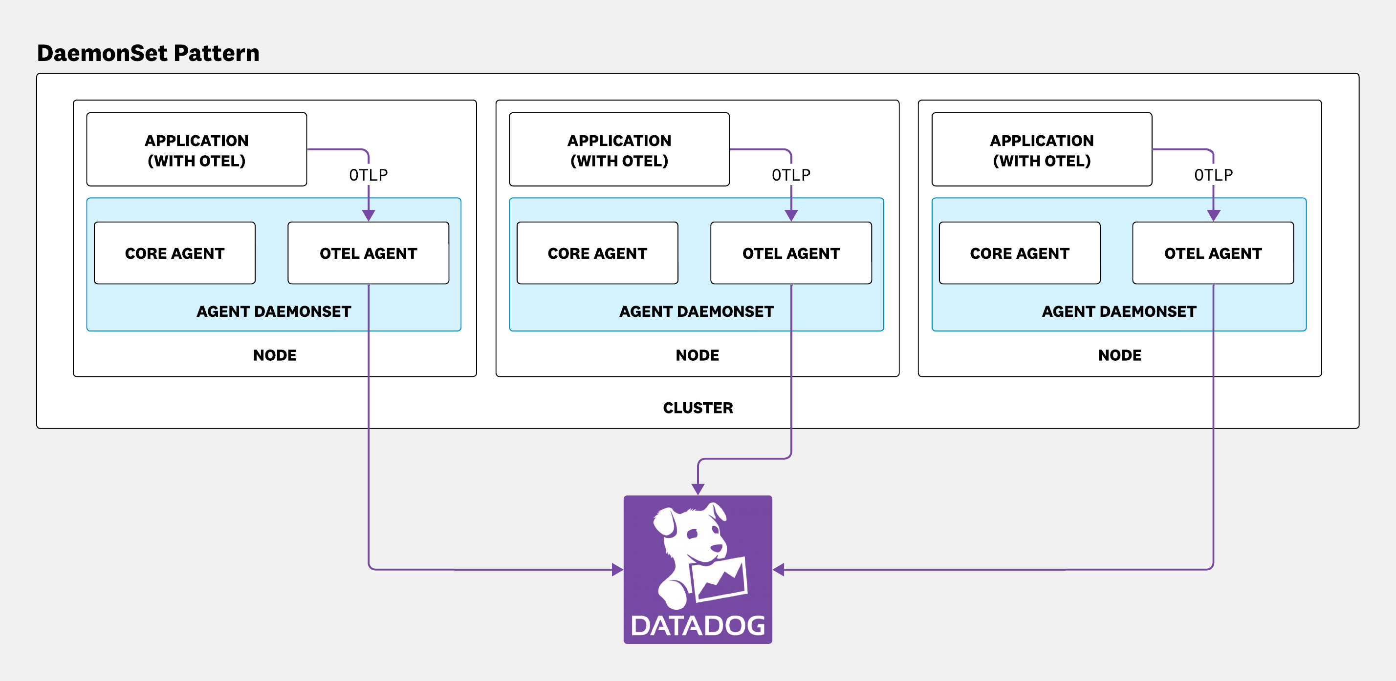 The OpenTelemetry Collector can be deployed in multiple ways. The daemonset pattern is a common deployment where a Collector instance runs on every Kubernetes node alongside the core Datadog Agent.