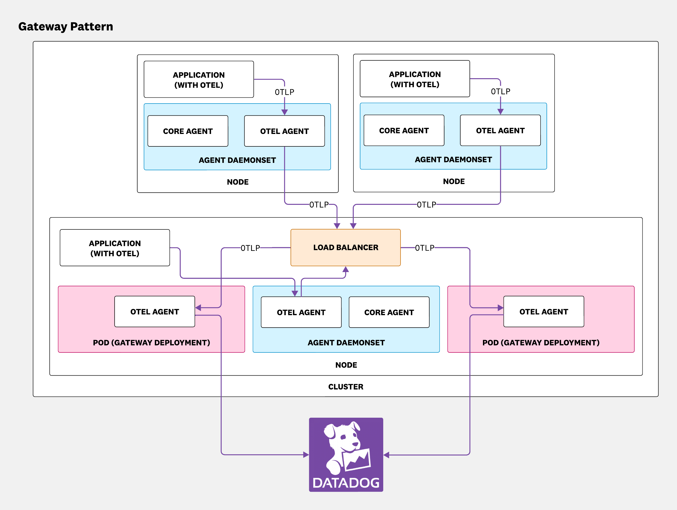 ) exposes the gateway pods and provides load balancing. - The existing DaemonSet Collector pods are configured by default to send their telemetry data to the gateway service instead of directly to Datadog.