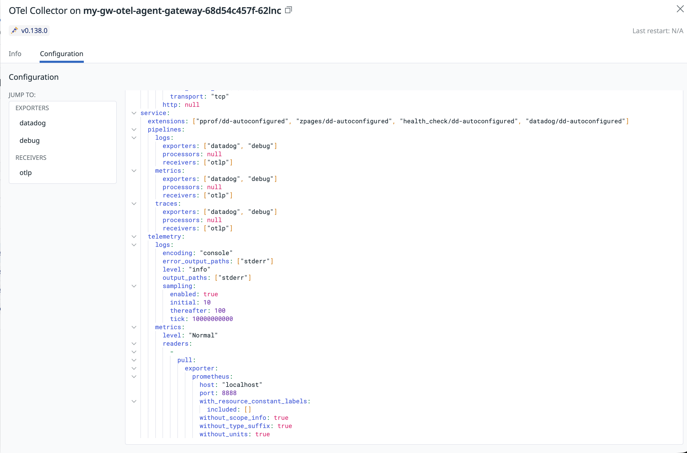 The DDOT Collector gateway includes the Datadog extension by default. This extension exports Collector build information and configurations to Datadog, allowing you to monitor your telemetry pipeline from Infrastructure Monitoring and Fleet Automation.