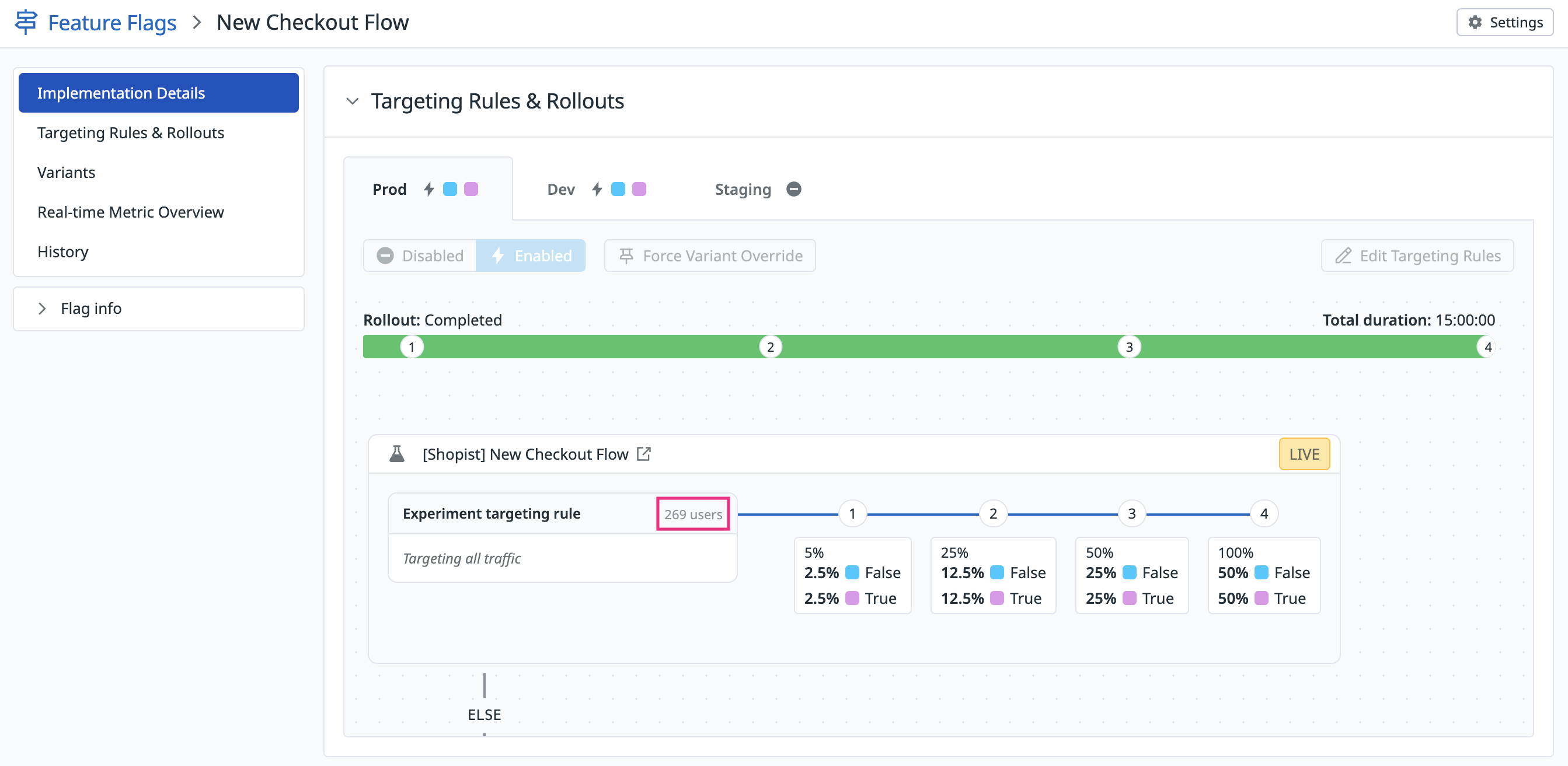 On the Feature Flags page, select the correct environment tab and confirm that the flag is Enabled. If the flag is disabled, enable it before proceeding.