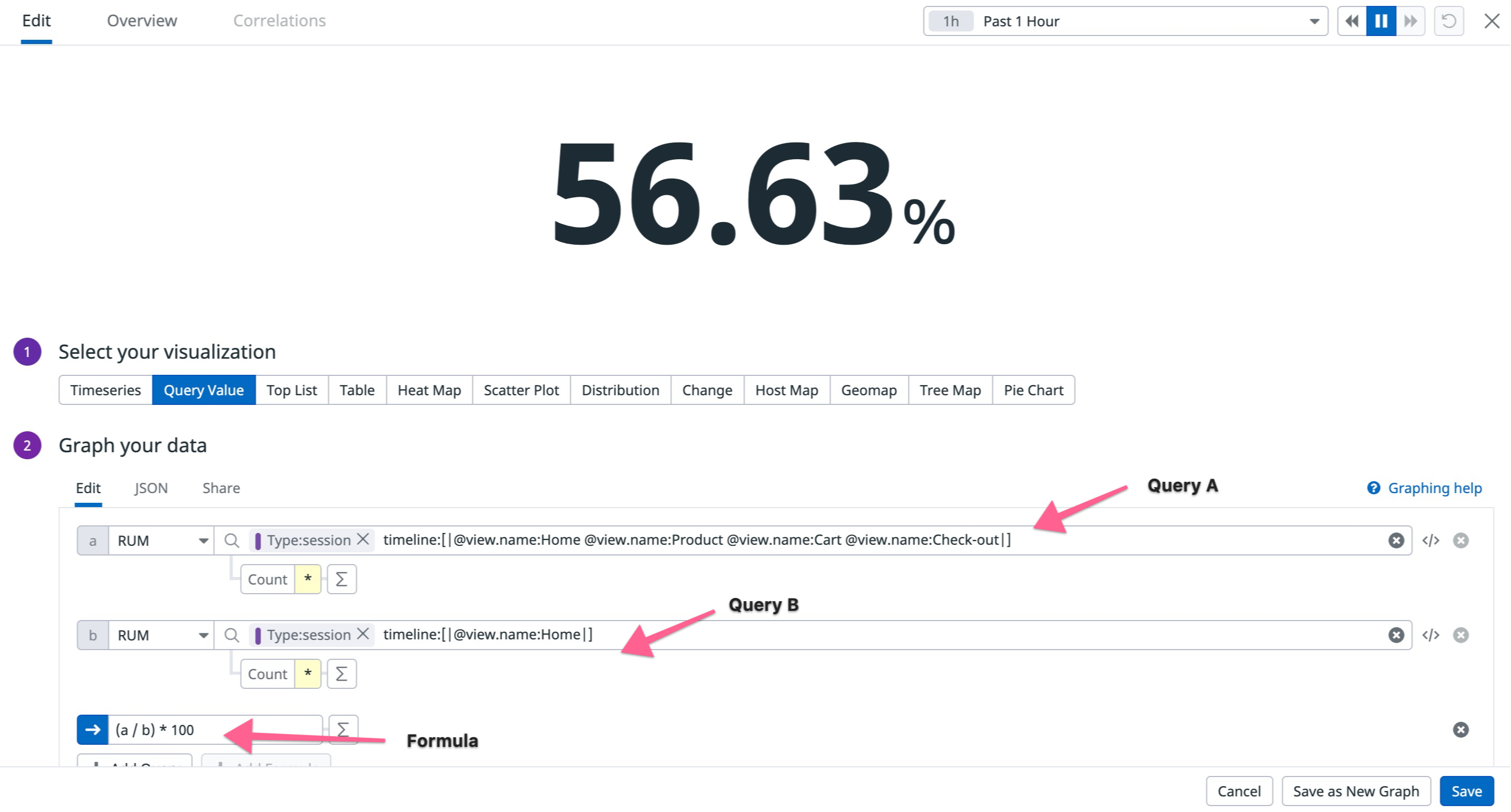 Copy and paste the queries from the dashboard into the RUM monitor’s query editor and add a formula using (a / b) * 100.
