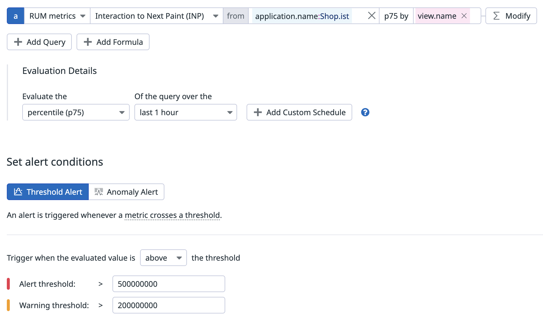 This example monitor warns when INP exceeds 200 milliseconds and alerts when INP exceeds 500 milliseconds. With metric-based monitors, you can also use anomaly detection to help identify when performance metrics deviate from normal patterns, or use forecast alerts to predict when thresholds might be breached.