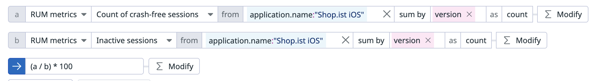 This example uses mobile RUM to evaluate application stability across release versions. The monitor is filtered to a specific application (for example, Shop.ist iOS) and grouped by version to help identify regressions tied to specific releases. The query combines crash-free sessions and total sessions to calculate the crash-free rate as a percentage.