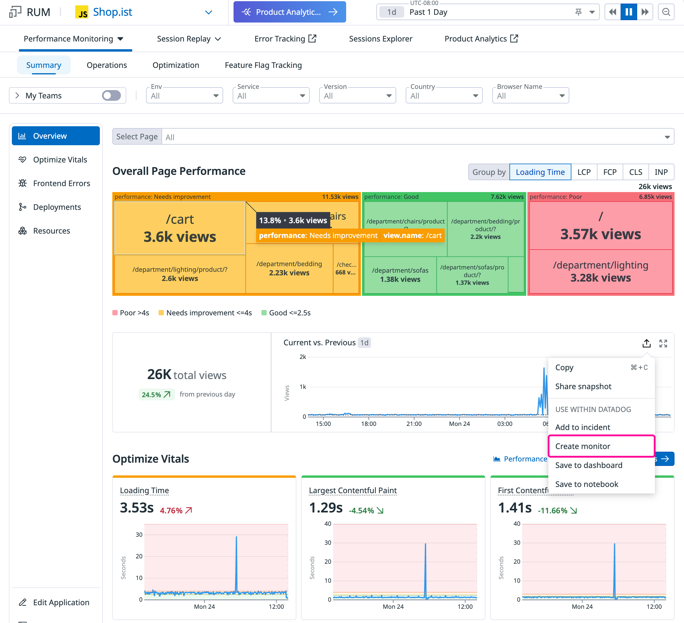 - Build a custom monitor: Choose from out-of-the-box metrics or custom metrics, then scope to your application, specific pages, or views.