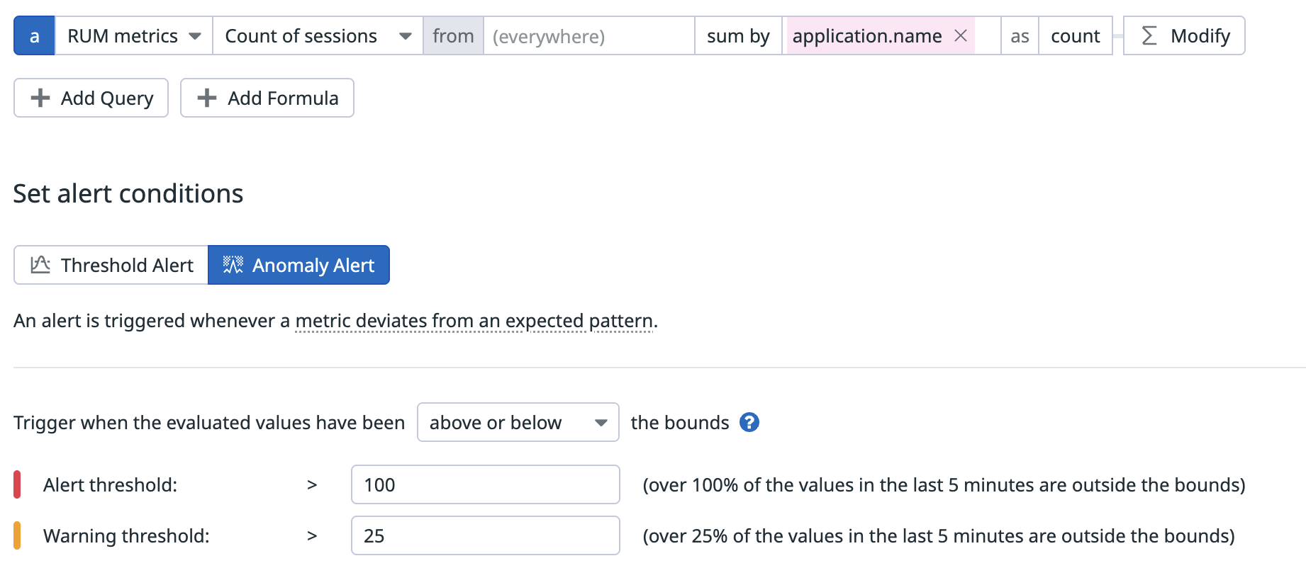 Real User Monitoring (RUM) lets you create alerts about atypical behavior in your applications. With RUM without Limits™, use metric-based monitors to alert on your full unsampled traffic with 15-month retention. Metric-based monitors support advanced alerting conditions such as anomaly detection.