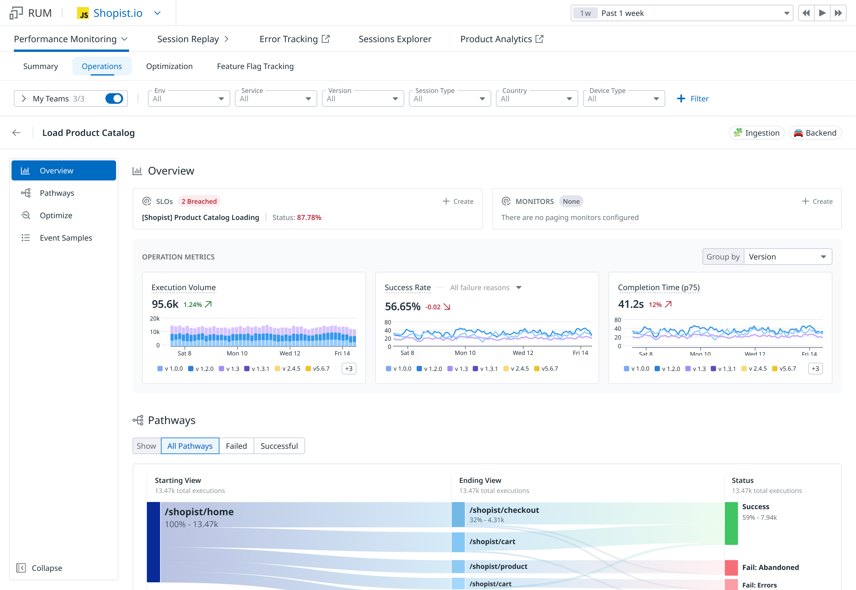 For example, the checkout experience of an e-commerce platform is a feature. Within it, operations might include entering payment details, saving a payment method, and completing a purchase. After the SDK has been instrumented, Datadog RUM measures each operation’s performance, including execution volume, completion rate, and failure rate. Measuring operations’ health enables you to identify exactly when and why users may not convert in your feature.