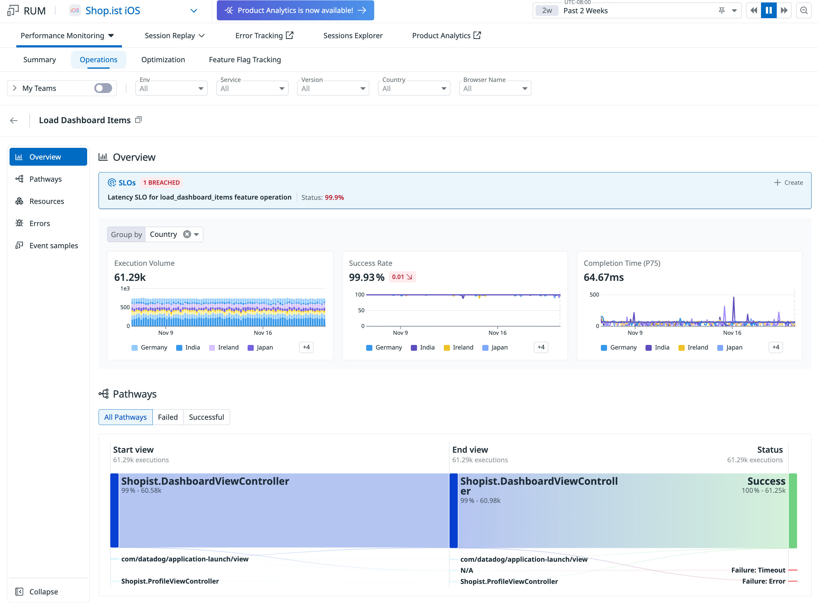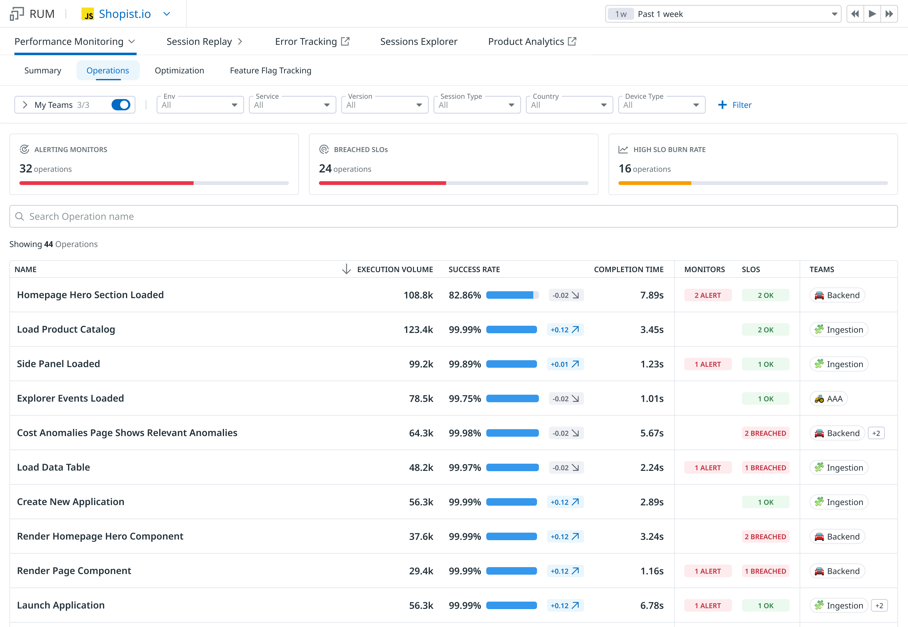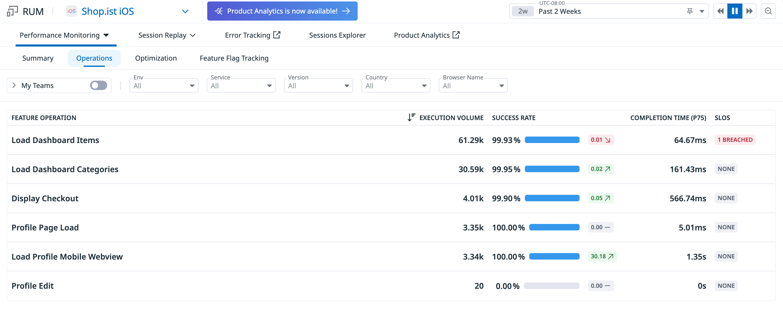 After you’ve configured the SDK APIs, you can monitor your operations by navigating to RUM > Performance Monitoring > Operations.