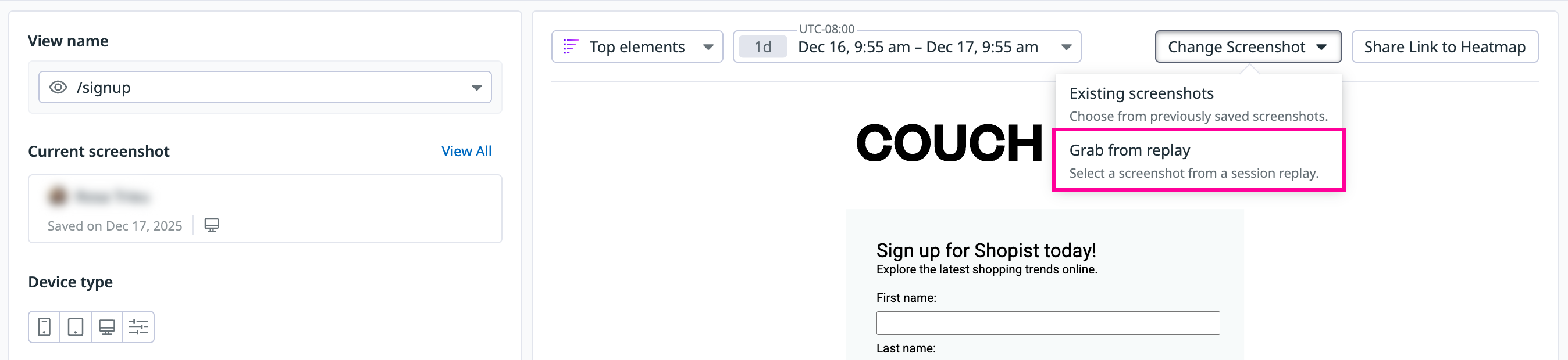From the heatmap view, click the Change Screenshot button. Choose from existing screenshots previously saved by teammates, or grab a screenshot from a Session Replay.