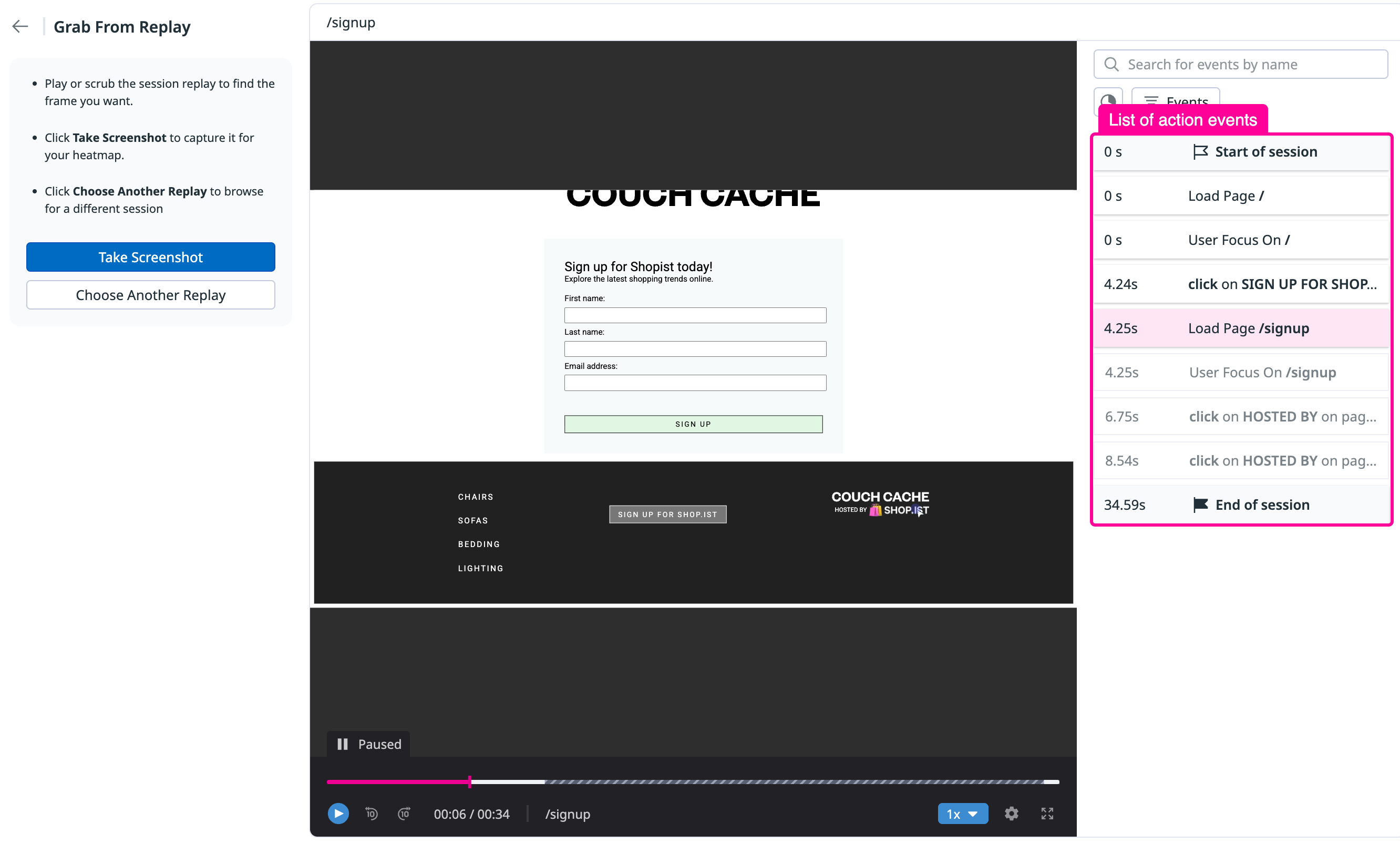 Heatmaps are generated with Session Replay data. Datadog automatically selects a replay that is both recent and closely matches the initial state of the page. In some cases, you might want to see the heatmap for a different view state. To switch the screenshot of your heatmap, click Change Screenshot, then Grab from replay to navigate through the different states of a replay and find the one you are looking for. If the replay you’re viewing does not have the screenshot you’re looking for, you can use the Choose Another Replay button to select another replay of the same view.