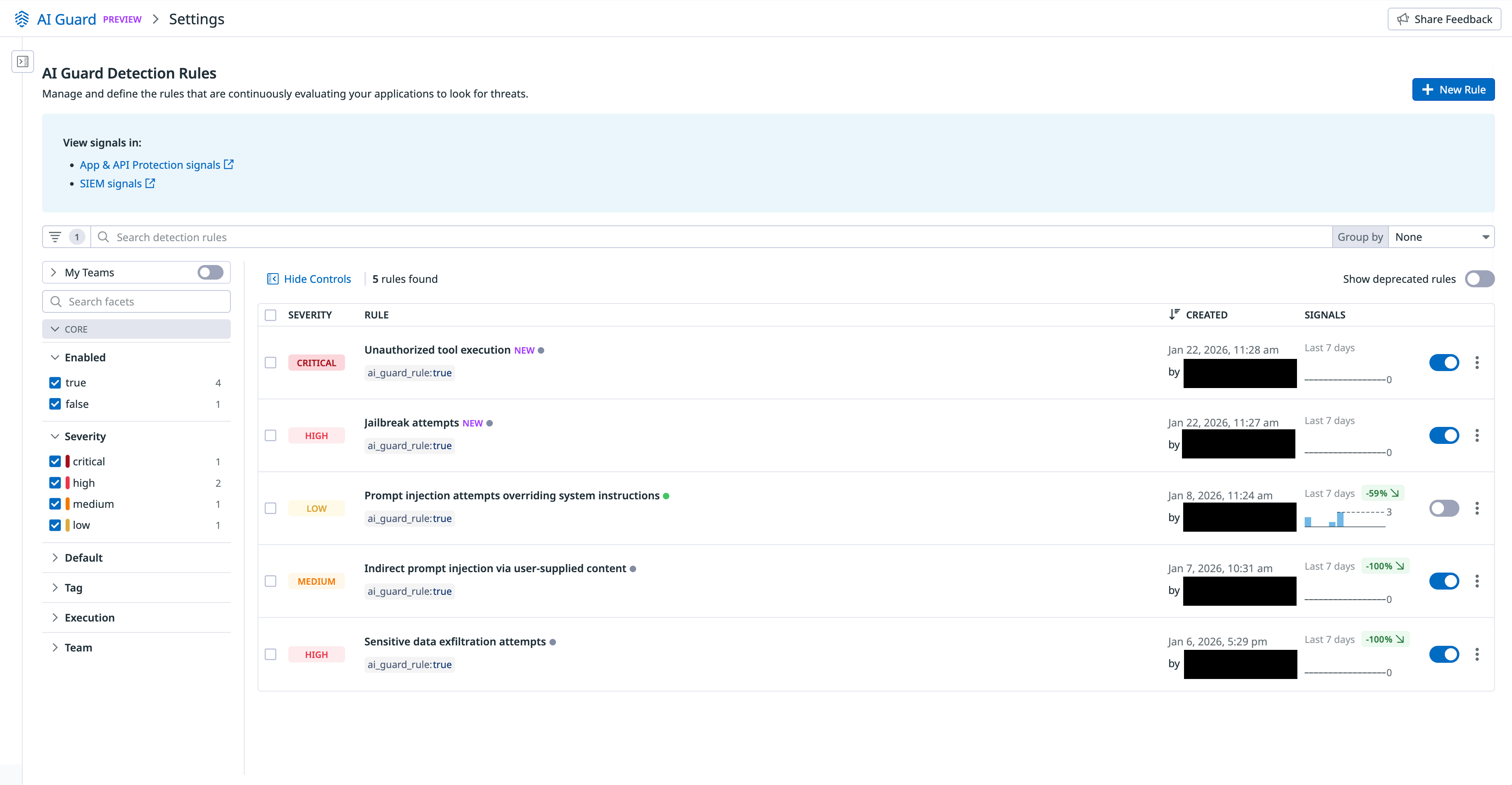 You can create custom detection rules by defining thresholds for when you want to receive notifications; for example, more than 5 DENY actions in 10 minutes. When AI Guard evaluations exceed those thresholds, it generates security signals.