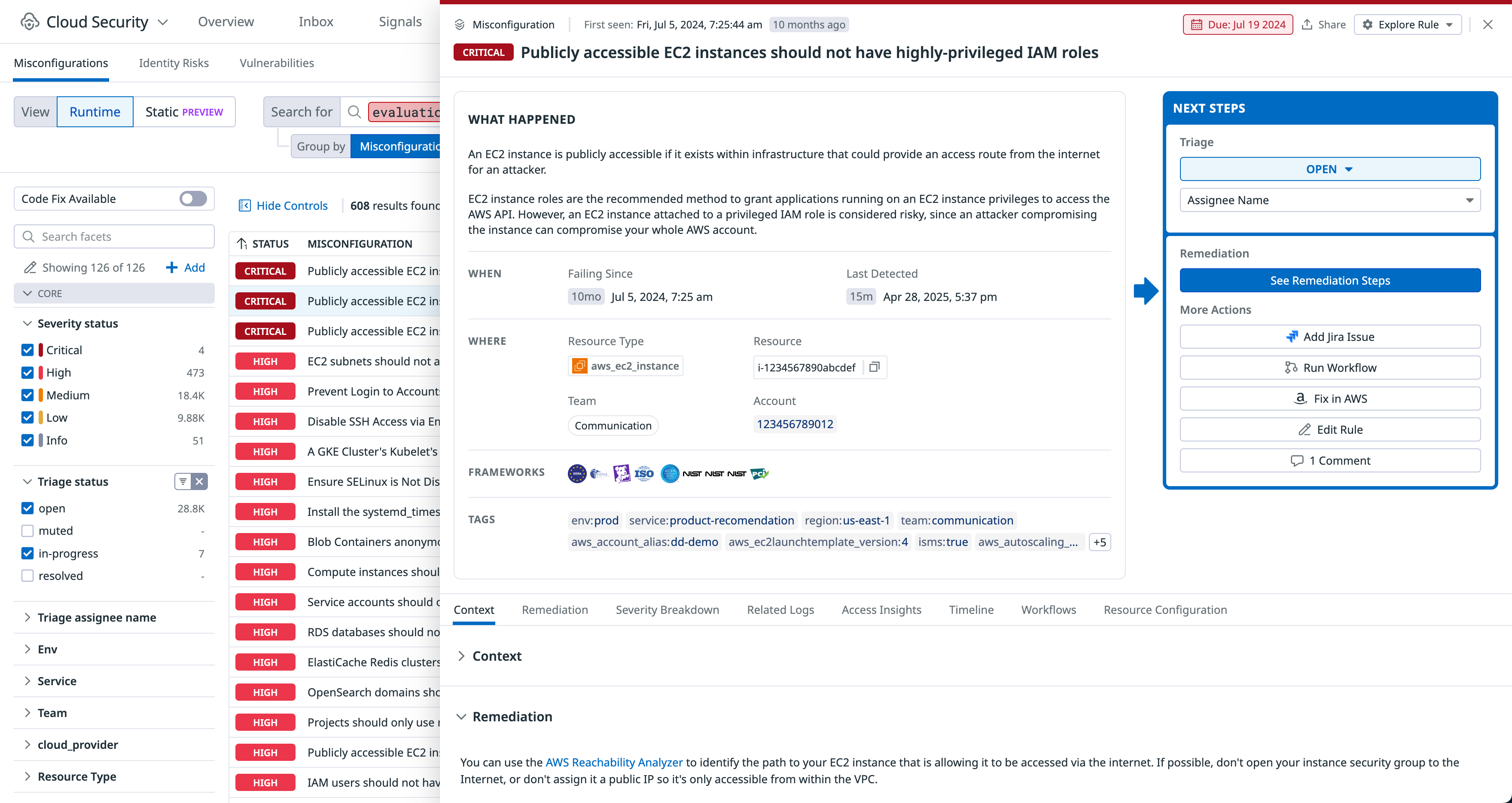 Investigate details using the Misconfigurations Findings page, where you can view detailed information about a resource, such as configuration, compliance rules applied to the resource, and tags that provide additional context about who owns the resource and its location within your environment. If a misconfiguration does not match your business use case or is an accepted risk, you can mute the misconfiguration up to an indefinite period of time.