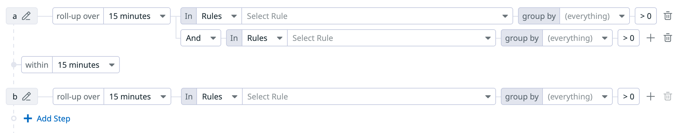 Set group by fields (for example, @usr.email or @ip.address) to link entities across steps.