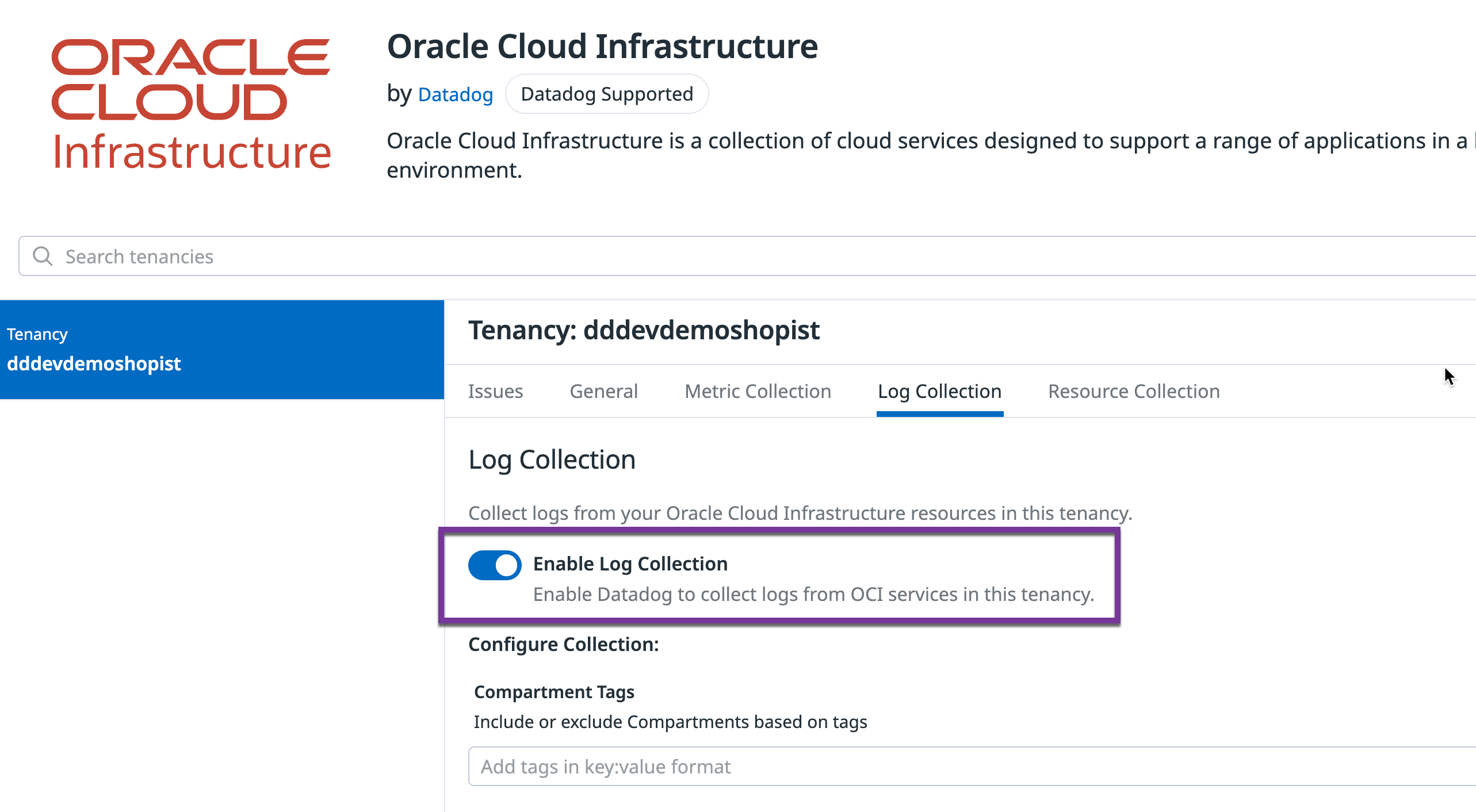 Ensure that log collection is enabled in the Datadog OCI integration tile: