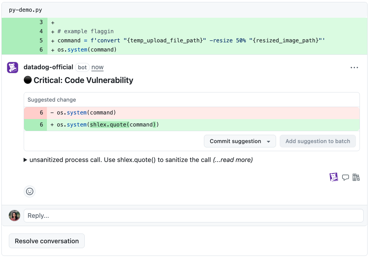 A Datadog bot has posted an inline comment on a GitHub pull request flagging a "Critical: Code Vulnerability". The comment suggests replacing the code os.system(command) with os.system(shlex.quote(command)) to sanitize the process call.
