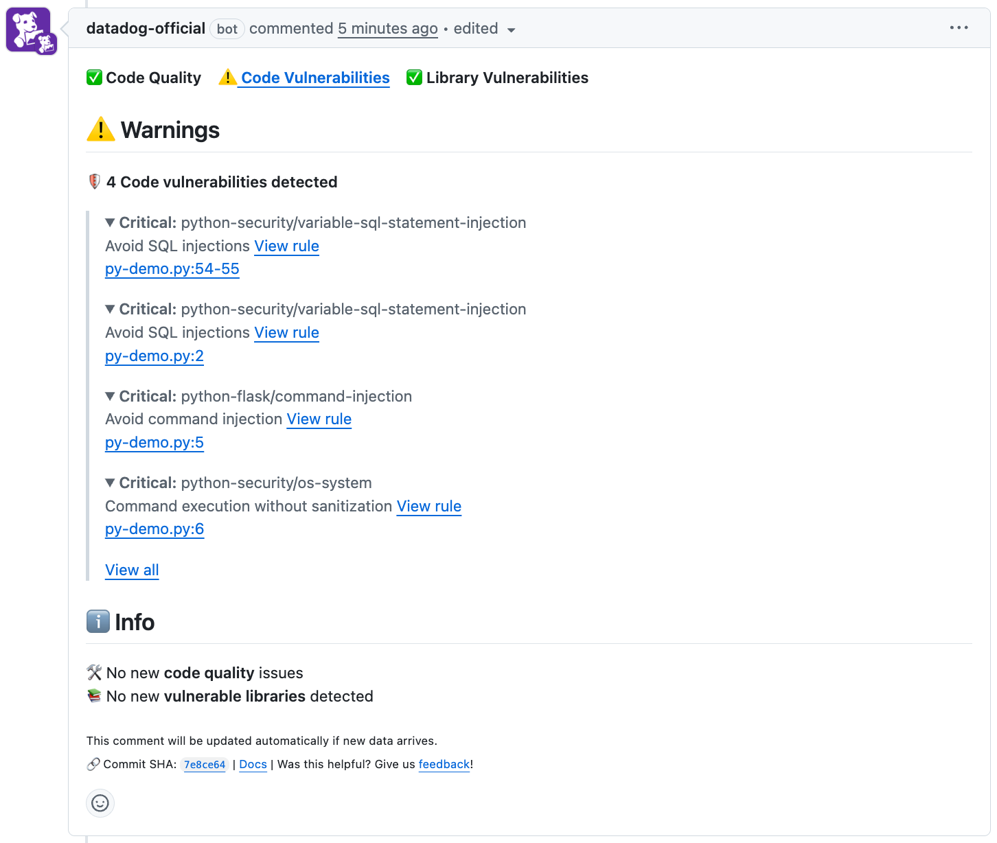 A Datadog bot has posted a summary comment on a GitHub pull request. The comment has a "Warnings" section that lists four critical code vulnerabilities, such as SQL and command injections, with links to the specific files and lines of code.