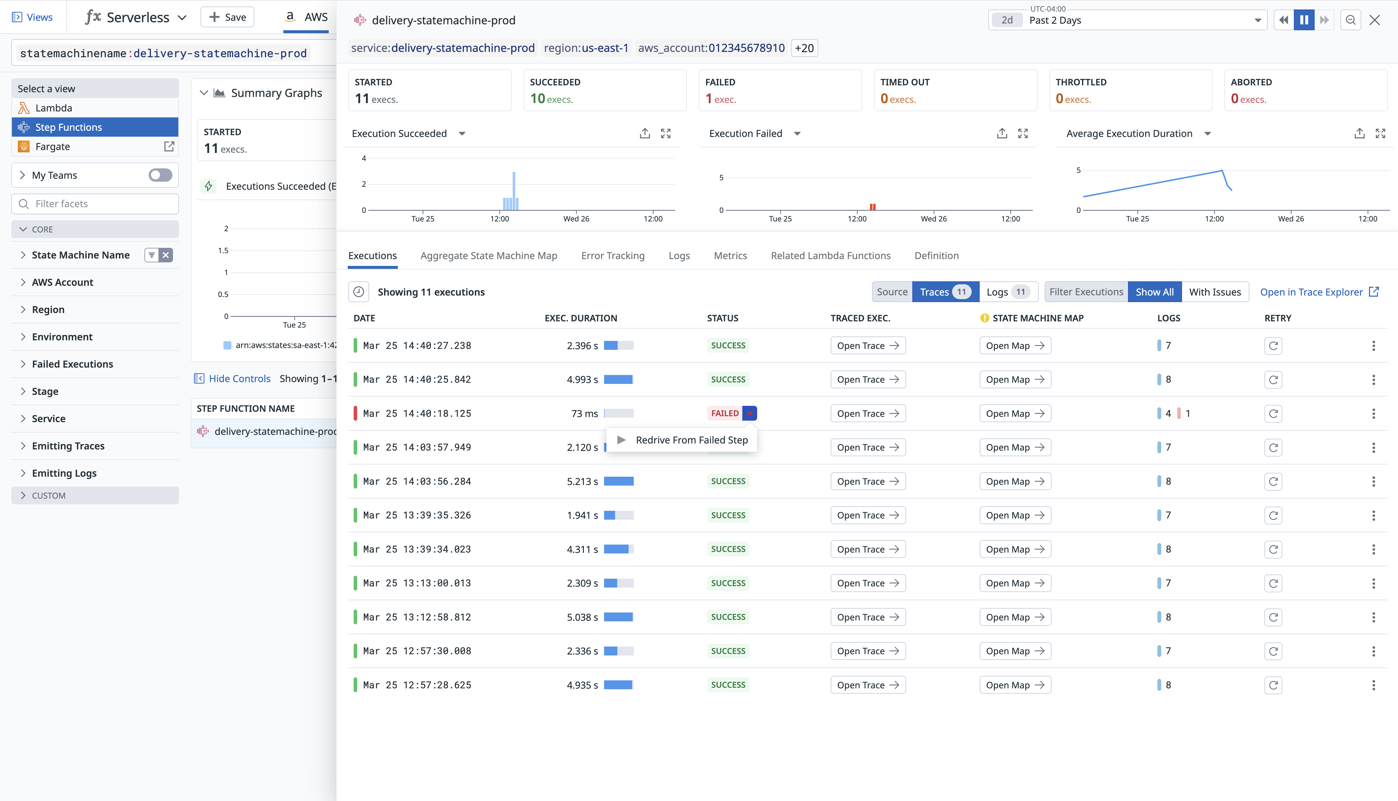 This page explains how to redrive executions directly from Datadog to continue failed AWS Step Functions from the point of failure without a state machine restart.