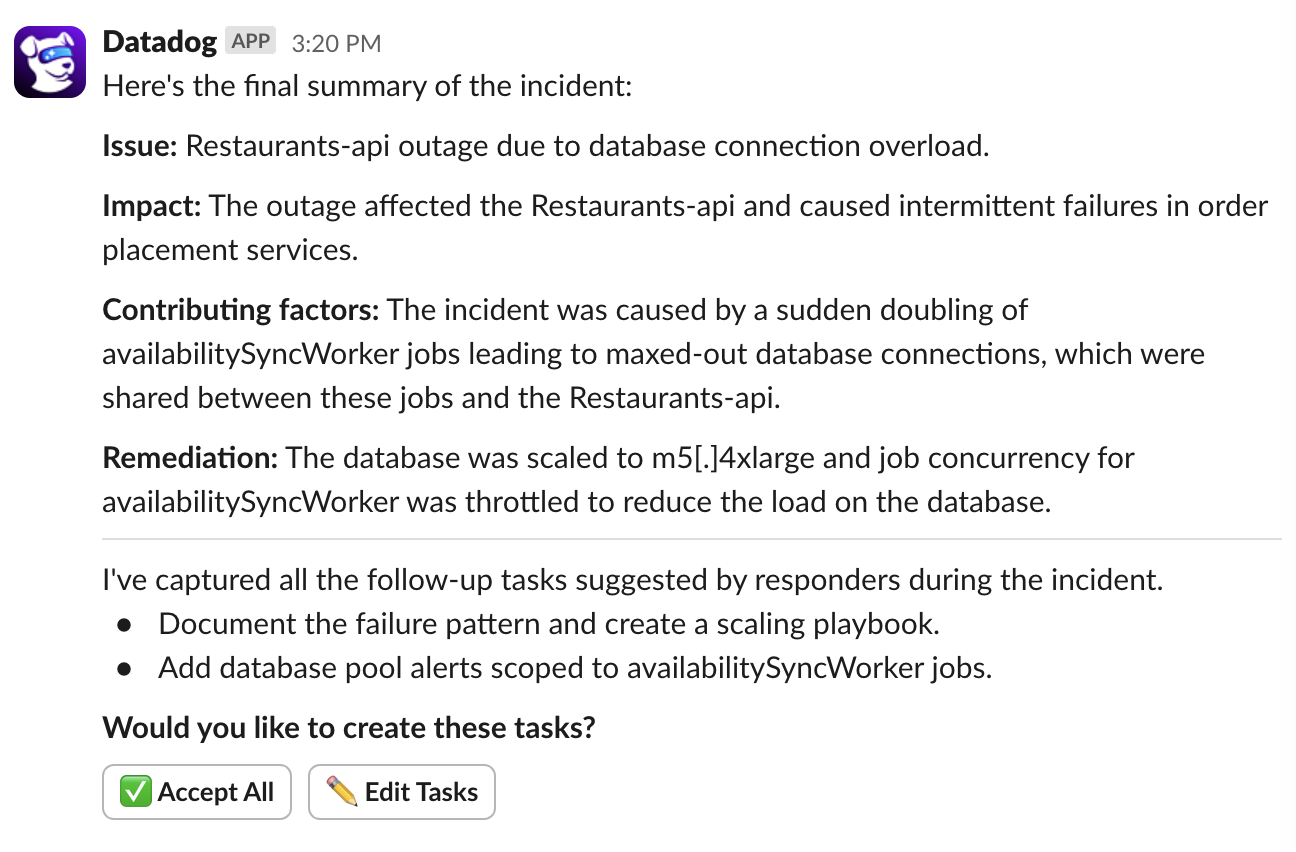 After an incident is resolved, Incident AI collects any follow-up tasks responders mentioned during the incident. It then prompts you to review and create them with a single click. These tasks are saved as Incident Follow-Ups in Datadog Incident Management. For more information, see Incident Follow-ups.