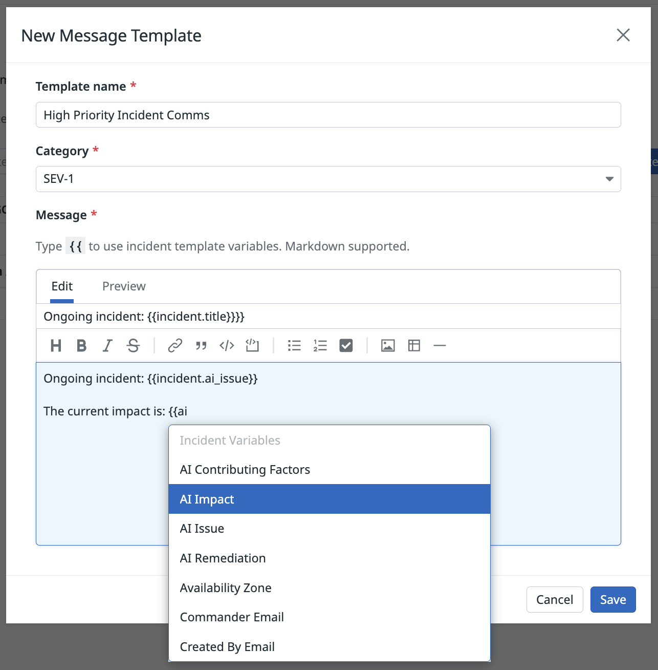 - AI-enhanced notifications: Dynamically populate stakeholder updates with AI-generated summaries of contributing factors, impact, and remediation across email, MS Teams, Slack, and other channels.
