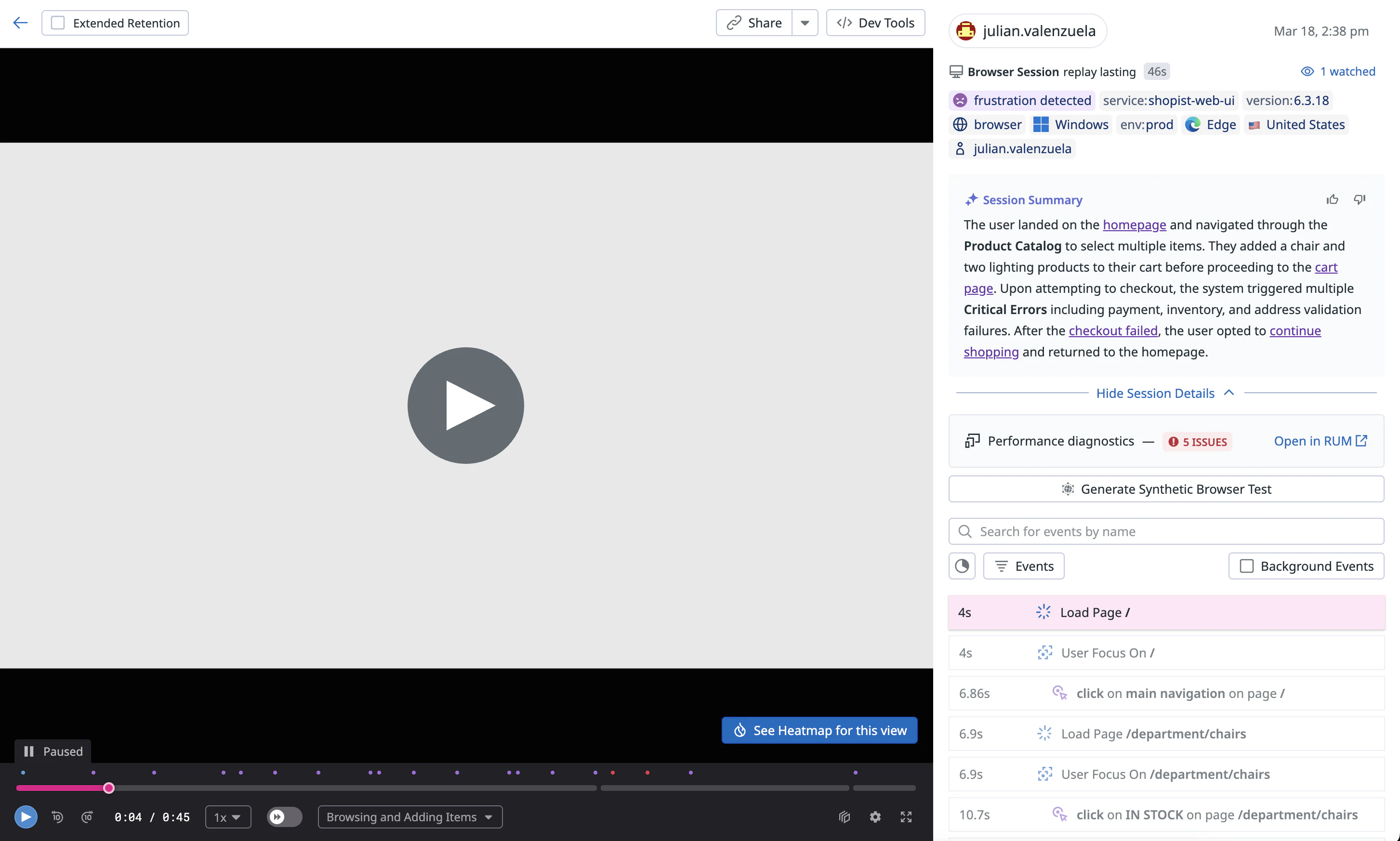 Browser Session Replay expands your user experience monitoring by allowing you to capture and visually replay the web browsing experience of your users. Combined with RUM performance data, Session Replay is beneficial for error identification, reproduction, and resolution, and provides insights into your web application’s usage patterns and design pitfalls.