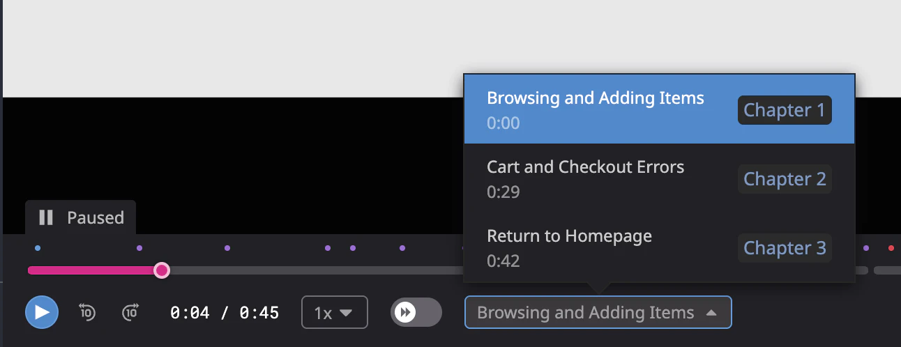 Smart chapters automatically segment the replay timeline into labeled stages of the user journey. For example, in an ecommerce session, chapters might include “Browse lighting”, “Shop bedding and chairs”, and “Review cart and checkout”. Chapters appear when you hover over the timeline and in the dropdown on the player controls, letting you jump directly between them.