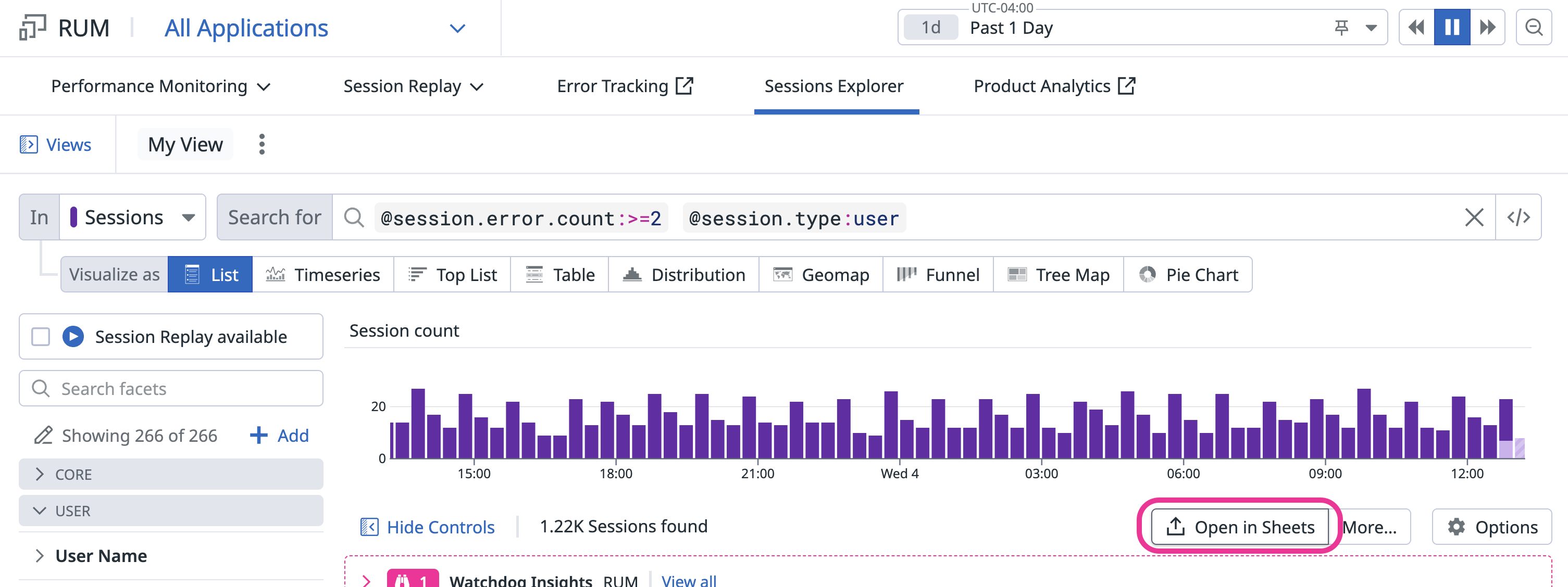 - Click on Open in Sheets to create a new table with your filtered RUM sessions data.