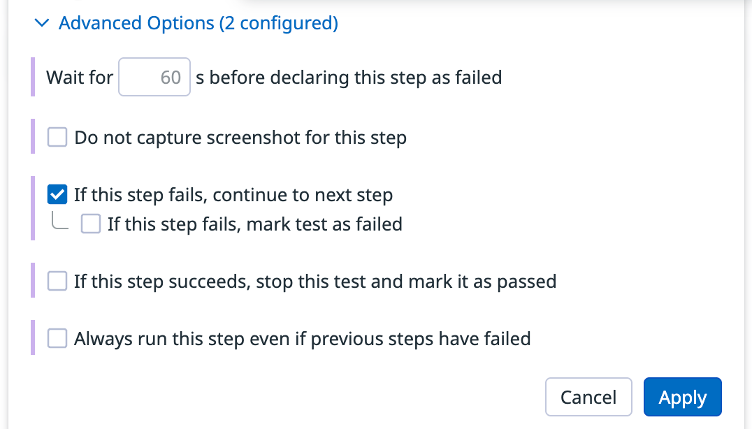 • If this step fails, continue to next step: Prevents a failure from stopping the entire test.