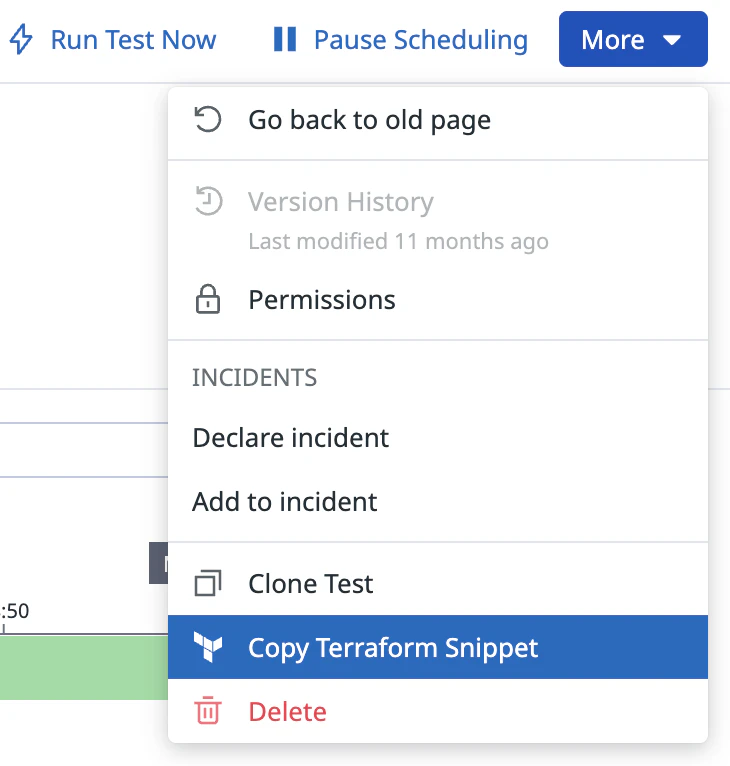 You can export existing Synthetic tests to Terraform directly from the Datadog UI. The export generates a ready-to-use datadog_synthetics_test resource block in HCL format and copies it to your clipboard. Paste it into your Terraform files to start managing your tests as code.