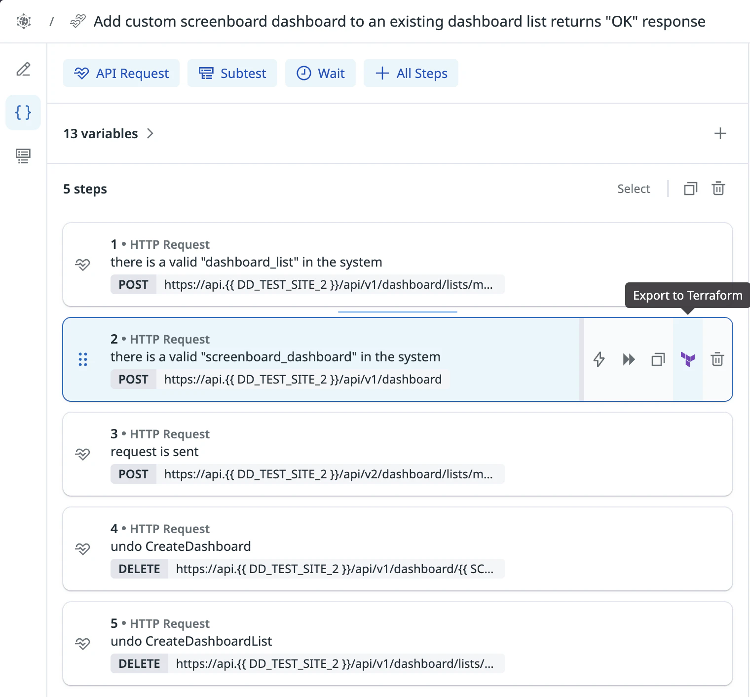 You can export individual steps to Terraform while recording or editing a browser test. Each step exports a configuration snippet you can use as part of a datadog_synthetics_test resource.