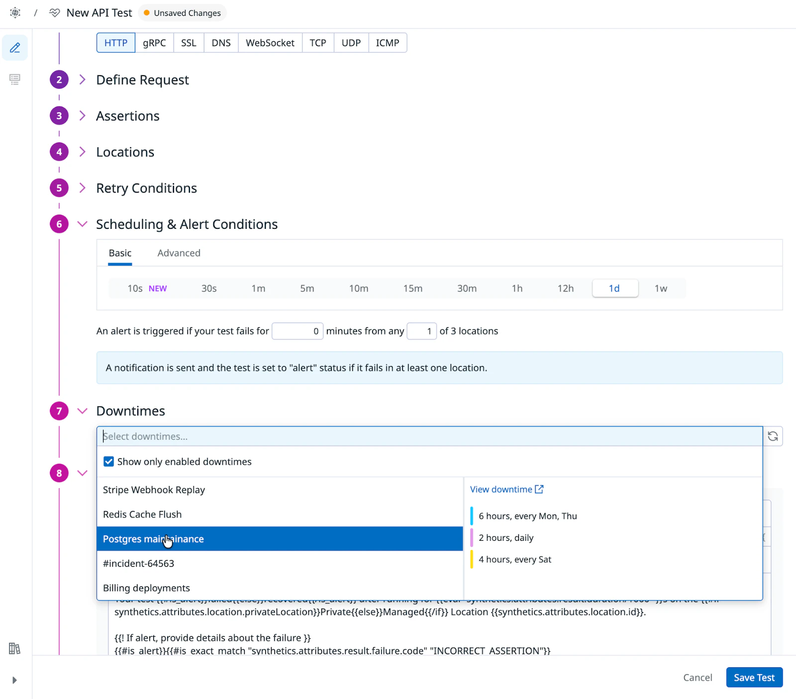Note: You cannot create a downtime from the test creation form. To create one, navigate to Settings > Downtimes.