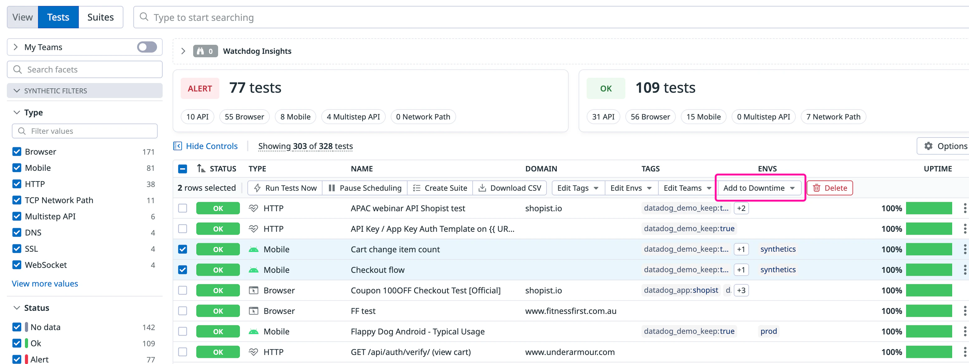 - Apply downtime to individual tests, multiple tests, or test suites in bulk.
