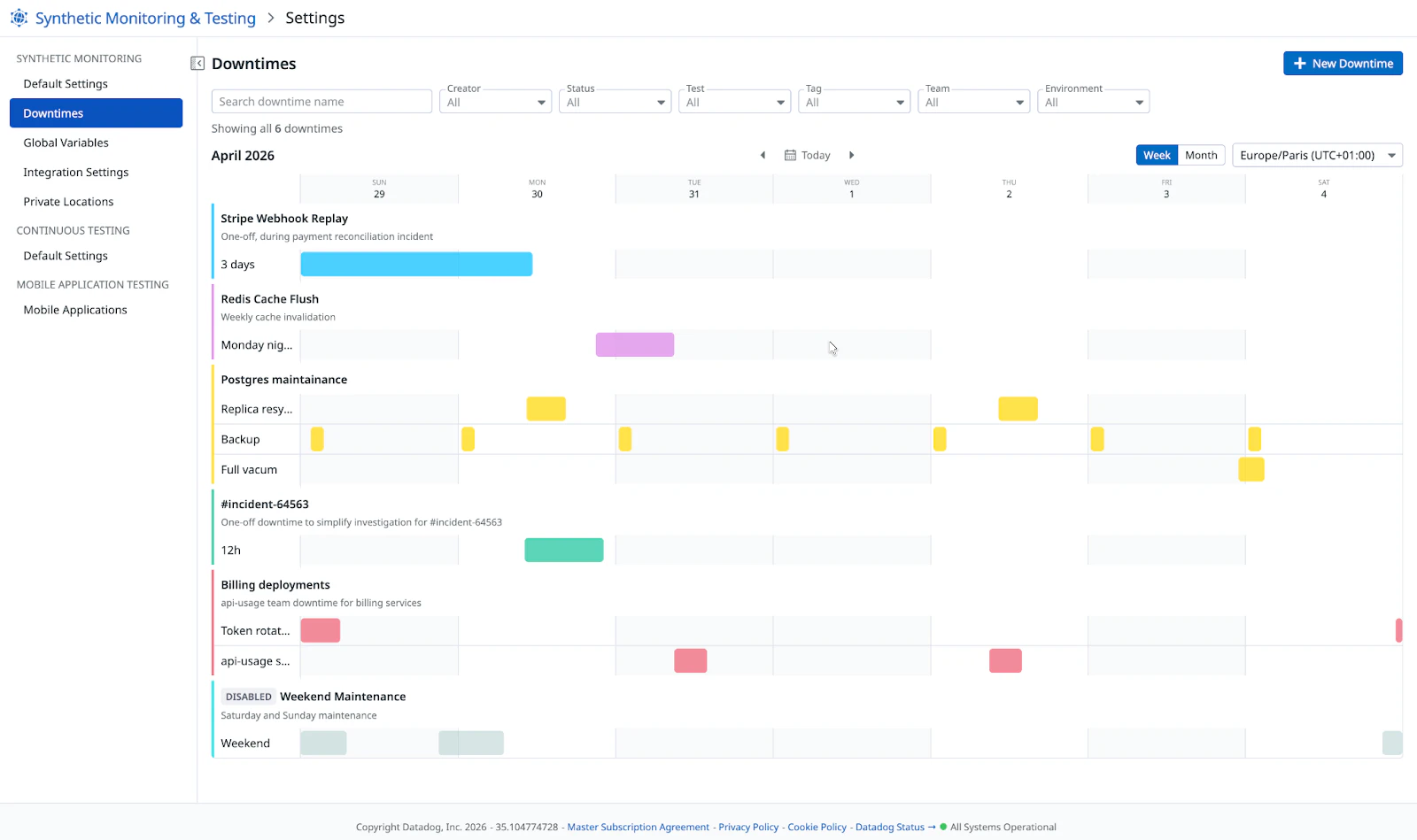 Synthetic Monitoring Scheduled Downtime lets you pause Synthetic test execution during planned maintenance windows. Unlike the Downtime feature for monitors, which mutes alerts but allows tests to continue running, Synthetic Monitoring Scheduled Downtime stops test execution entirely. This keeps your availability and performance metrics accurate and prevents unnecessary test runs and associated costs during expected outages.