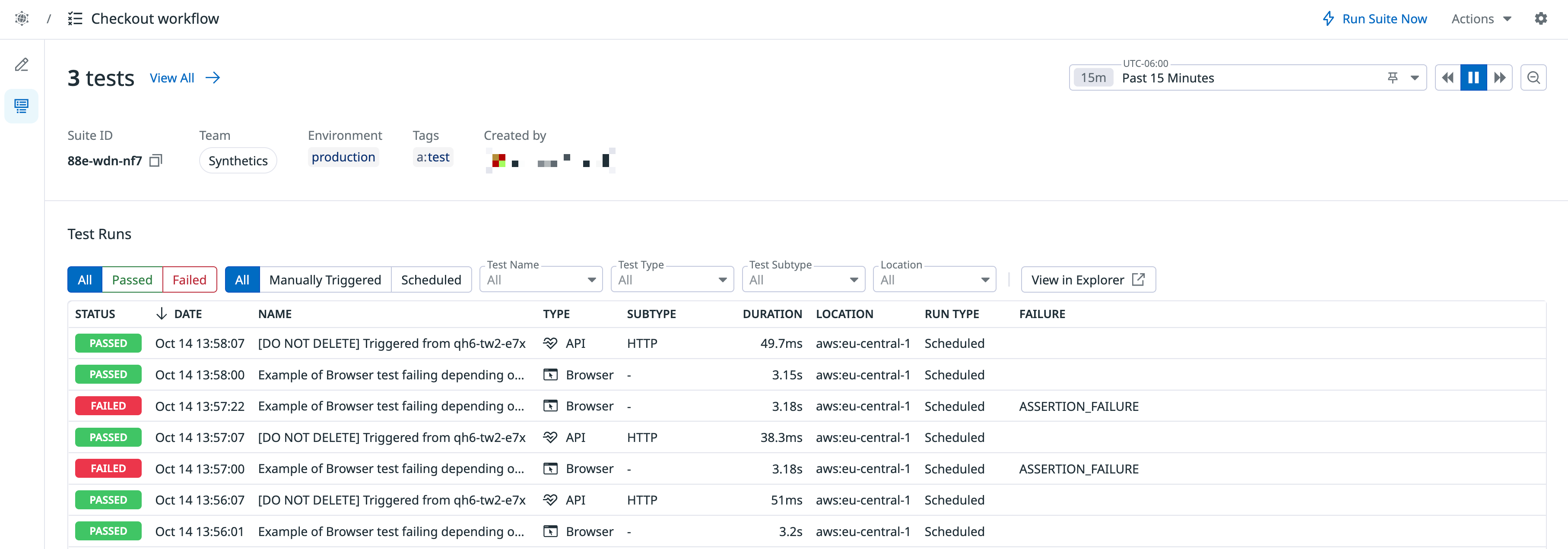 Note: Test runs appear in the suite only from the date the test was added. To view earlier results, check the individual test page. If you rename a test, previous runs remain listed under the original name. A maximum of 300 tests can be added per suite.