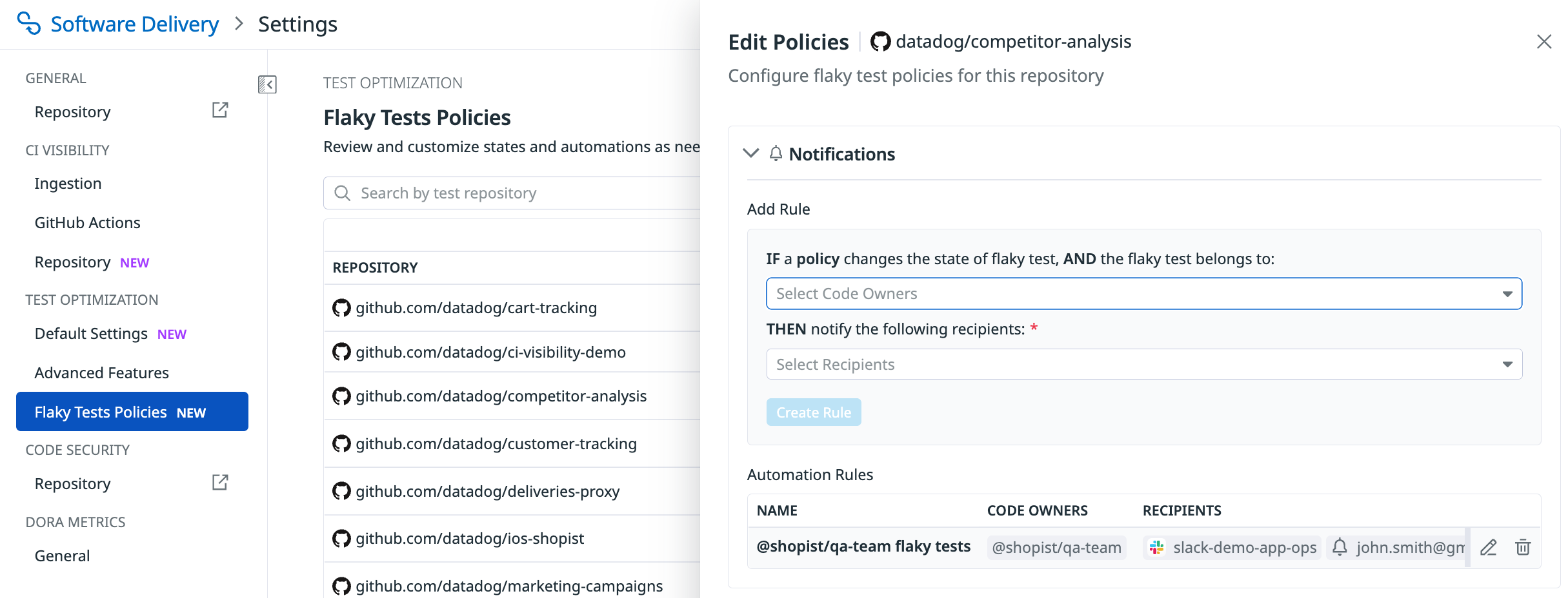 Set up notifications to track changes to your flaky tests. Whenever a user or a policy changes the state of a flaky test, a message is sent to your selected recipients. You can send notifications to email addresses or Slack channels (see the Datadog Slack integration), and route messages based on test code owners. If no code owners are specified, all selected recipients are notified of all flaky test changes in the repository. Configure notification for each repository from the Flaky Test Policies page in Software Delivery settings.