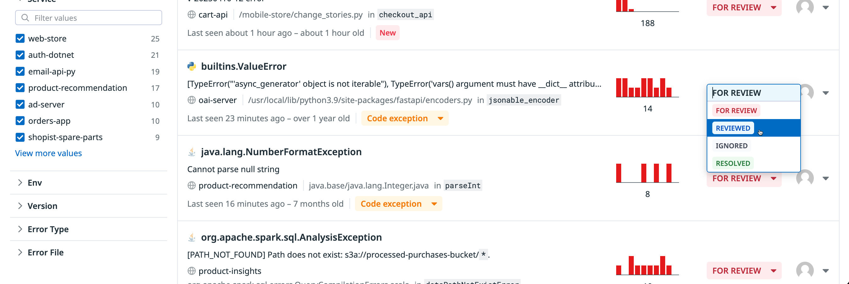 All issues start with a FOR REVIEW status. Error Tracking automatically updates the status in the cases described below, or you can manually update the status. You can also view the history of a given error’s state changes.