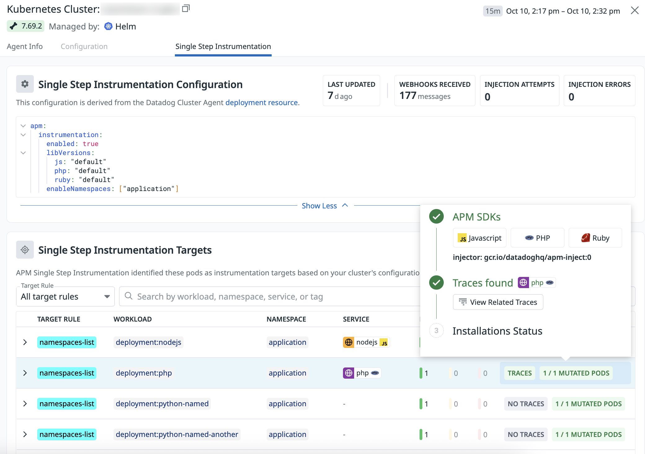 - The pods identified as instrumentation targets based on cluster configuration or pod-level annotations